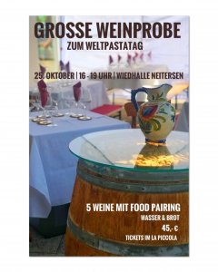Wir sind überzeugt von unseren Weinen und präsentieren sie Ihnen einmal monatlich samstags gerne in unserer unverwechselbaren und gemütlichen Atmosphäre. Wir nehmen Sie mit auf eine wunderbare, jedes Mal individuell für Sie zusammengestellte Reise durch die Apenninenhalbinsel. Lassen Sie sich von uns über Wein und Italien erzählen! In geschlossenen Gruppen von bis zu acht Personen genießen Sie unsere Weinvielfalt. Beim gemütlichen Beisammensitzen im Anschluss wird Ihnen ein reichhaltiges und authentisches Büffet serviert.